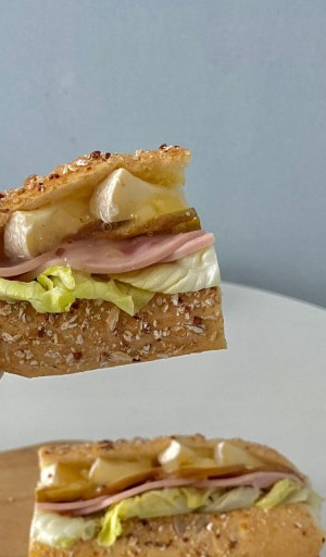사과, 햄 야채 , 브리치즈, 사과조림 등이 들어있고 브리치즈가 가득